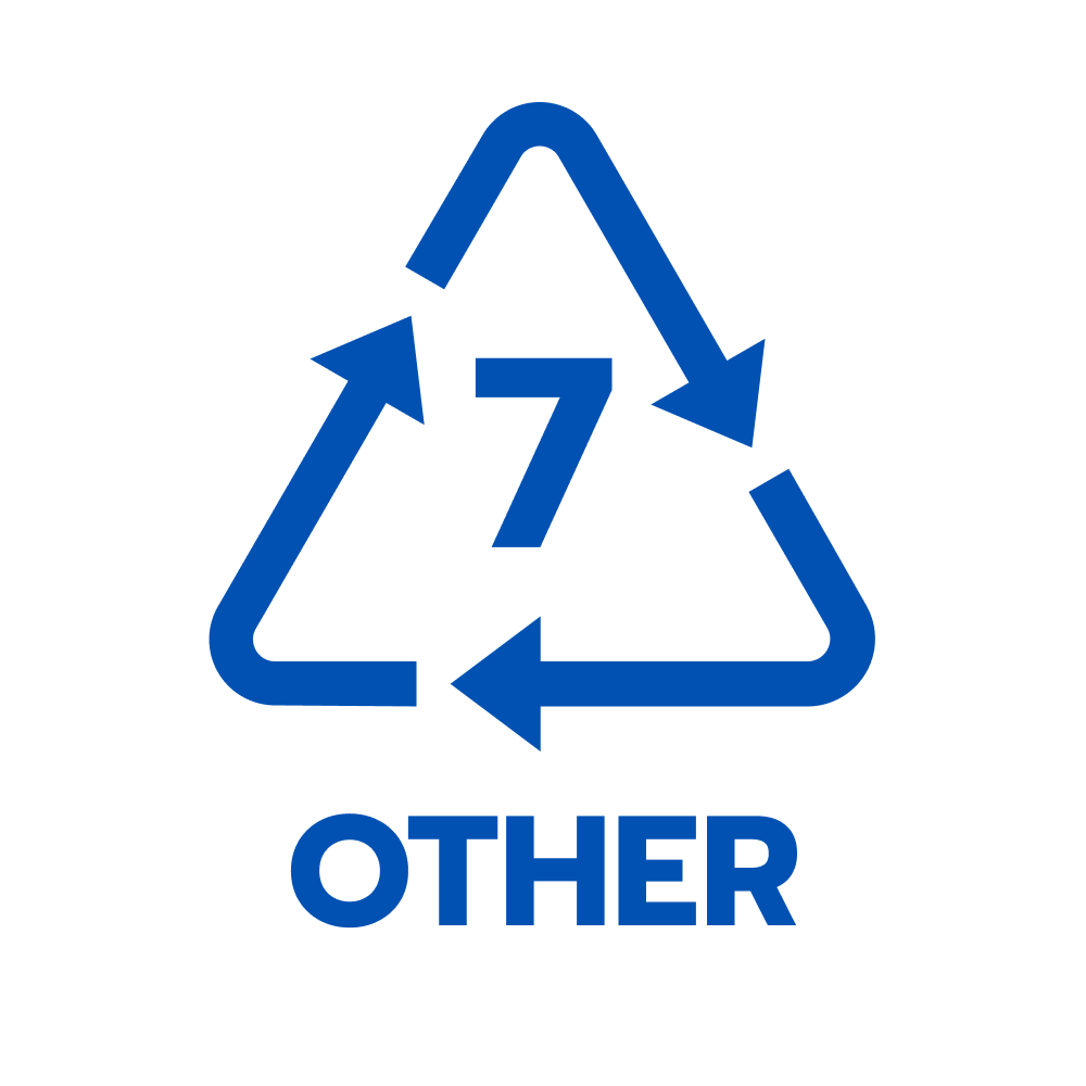 7.OTHER พลาสติกชนิดอื่นๆ นอกเหนือจากข้อ 1-6 ซึ่งส่วนใหญ่ถูกนำมาใช้ในเชิงอุตสาหกรรมอย่างแพร่หลาย จึงต้องมีสัญลักษณ์กำกับอย่างชัดเจน และ เมื่อมีพลาสติกชนิดใหม่ๆ เกิดขึ้นในโลก พลาสติกใหม่ๆ เหล่านั้น จึงถูกจัดหมวดหมู่ Other อาทิ โพลีคาร์บอเนต (PC) พลาสติกชีวภาพ โพลีแลคติกแอซิค (PLA) และโพลีบิวทิลีนอะดิเพด (PBAT) หรือพลาสติกเกรดวิศวกรรม เช่น โพลีบีวทีลีเทเรฟทาเลด (PBT) เป็นต้น นอกจากใช้สัญลักษณ์ Other การใช้เครื่องหมาย รีไซเคิล และกำกับด้วยตัวอักษร PC หรือ PLA ตามประเภทผลิตภัณฑ์พลาสติก ก็จะช่วยให้การรีไซเคิลพลาสติก
